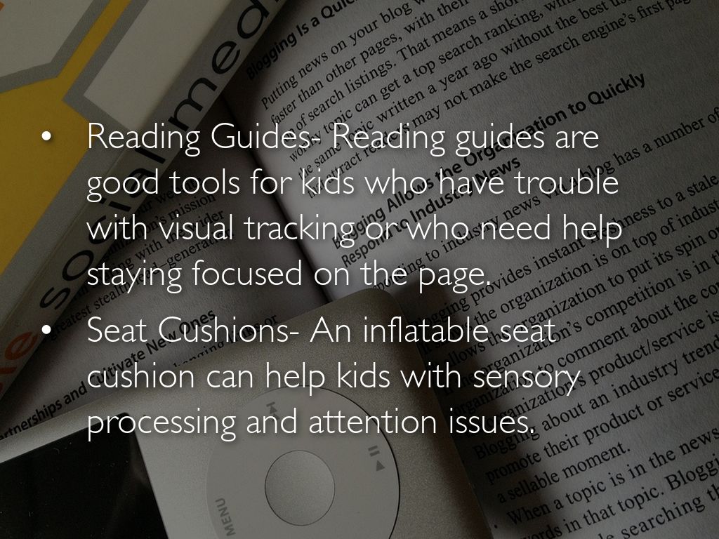 • Reading Guides- Reading guides are good tools for kids who have trouble with visual tracking or who need help staying focused on the page.