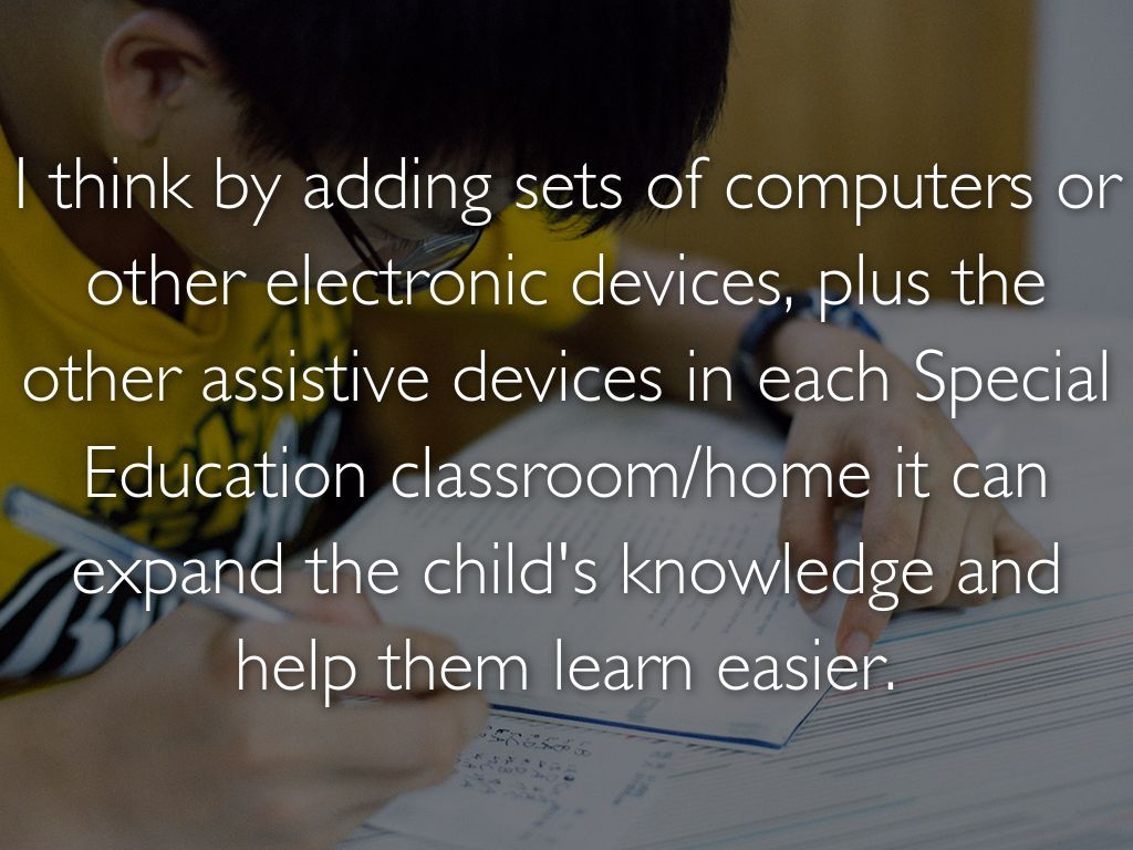I think by adding sets of computers or other electronic devices, plus the other assistive devices in each Special Education classroom/home it can expand the child's knowledge and help them learn easier.