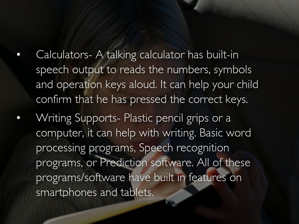 • Calculators- A talking calculator has built-in speech output to reads the numbers, symbols and operation keys aloud. It can help your child confirm that he has pressed the correct keys.