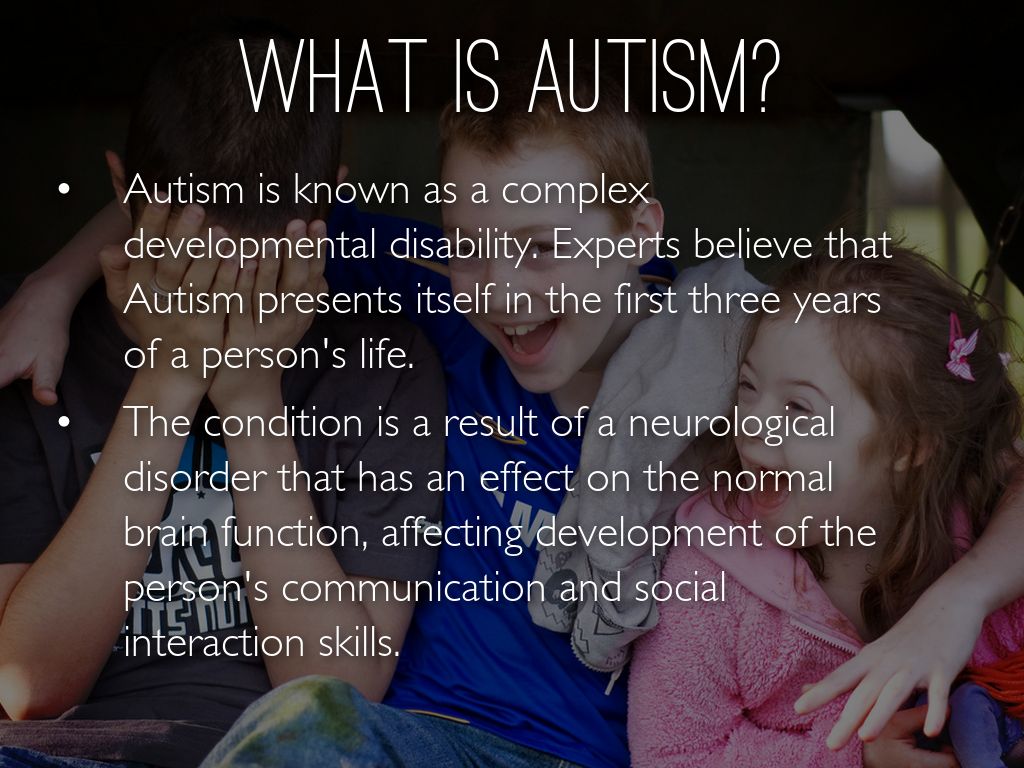• Autism is known as a complex developmental disability. Experts believe that Autism presents itself in the first three years of a person's life.