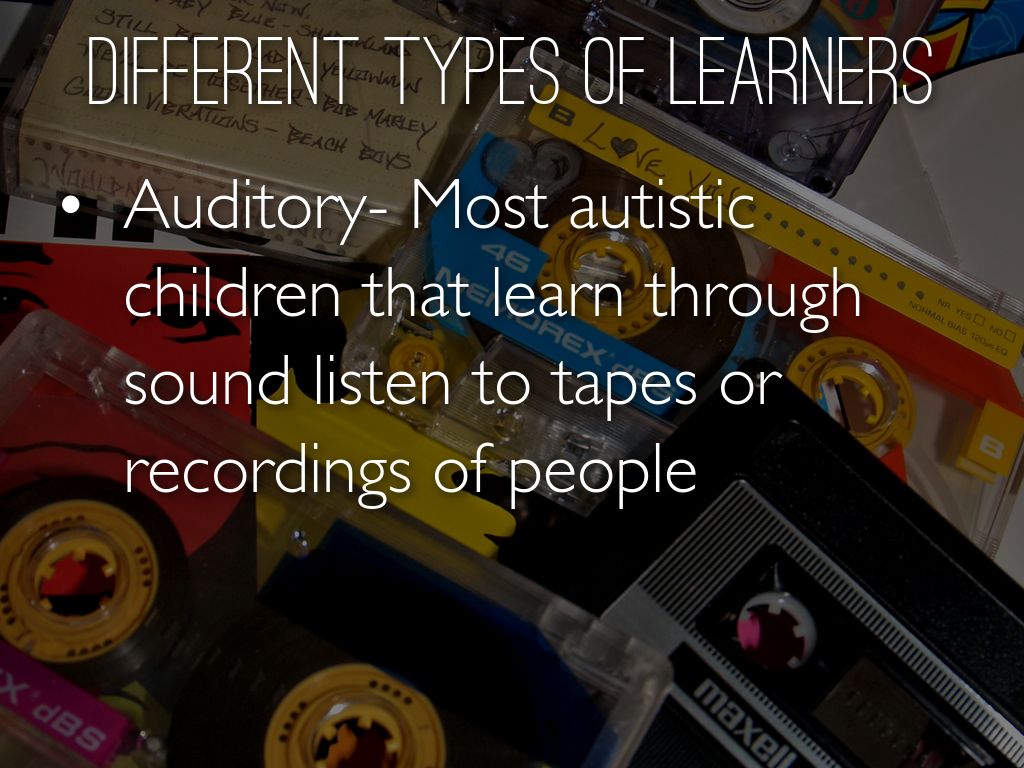 • Auditory- Most autistic children that learn through sound listen to tapes or recordings of people