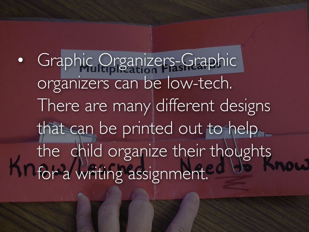 • Graphic Organizers-Graphic organizers can be low-tech. There are many different designs that can be printed out to help the child organize their thoughts for a writing assignment.