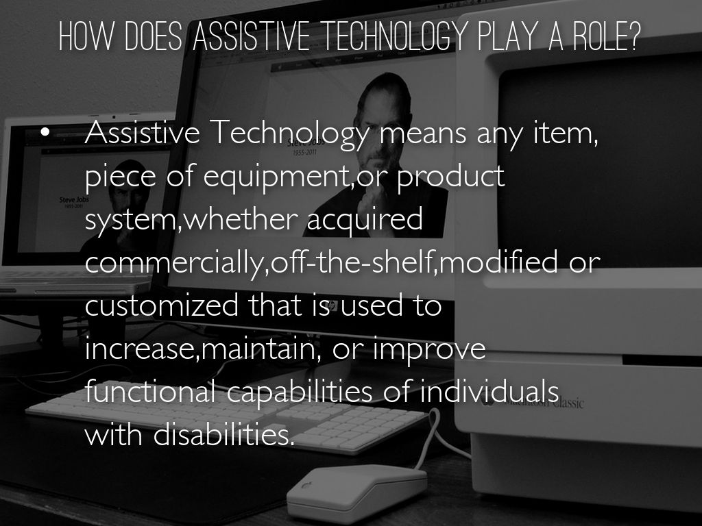 • Assistive Technology means any item, piece of equipment,or product system,whether acquired commercially,off-the-shelf,modified or customized that is used to increase,maintain, or improve functional capabilities of individuals with disabilities.