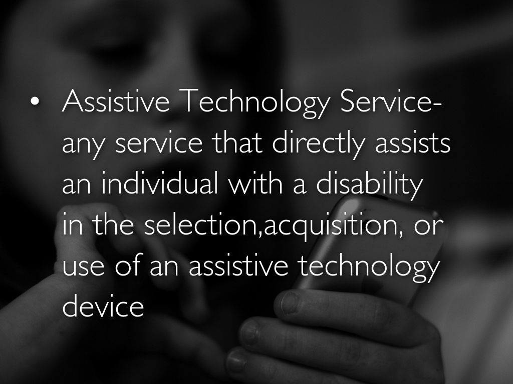 • Assistive Technology Service- any service that directly assists an individual with a disability in the selection,acquisition, or use of an assistive technology device