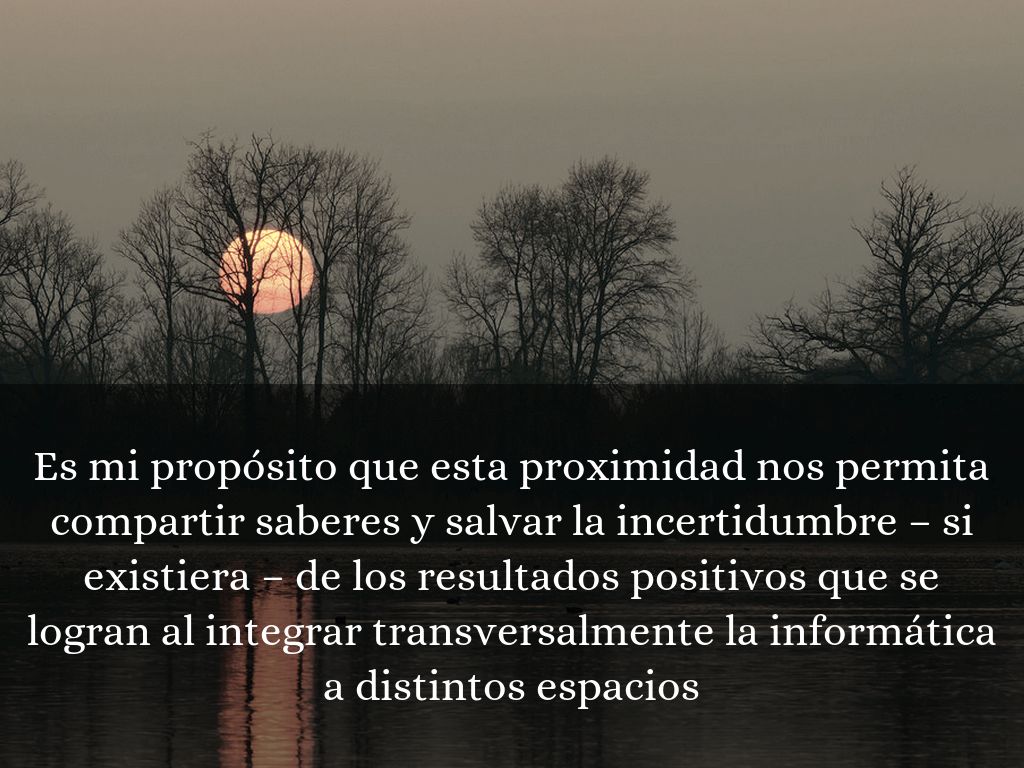 Es mi propósito que esta proximidad nos permita compartir saberes y salvar la incertidumbre – si existiera – de los resultados positivos que se logran al integrar transversalmente la informática a distintos espacios