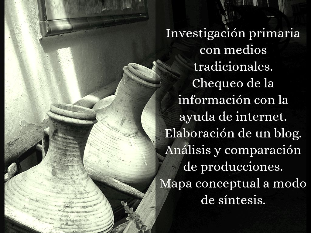 Investigación primaria con medios tradicionales. Chequeo de la información con la ayuda de internet. Elaboración de un blog. Análisis y comparación de producciones. Mapa conceptual a modo de síntesis.