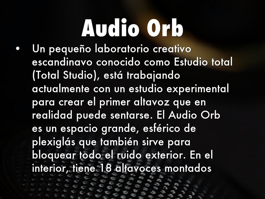 Un pequeño laboratorio creativo escandinavo conocido como Estudio total (Total Studio), está trabajando actualmente con un estudio experimental para crear el primer altavoz que en realidad puede sentarse. El Audio Orb es un espacio grande, esférico de plexiglás que también sirve para bloquear todo el ruido exterior. En el interior, tiene 18 altavoces montados listos para darle la experiencia audiófilo final.