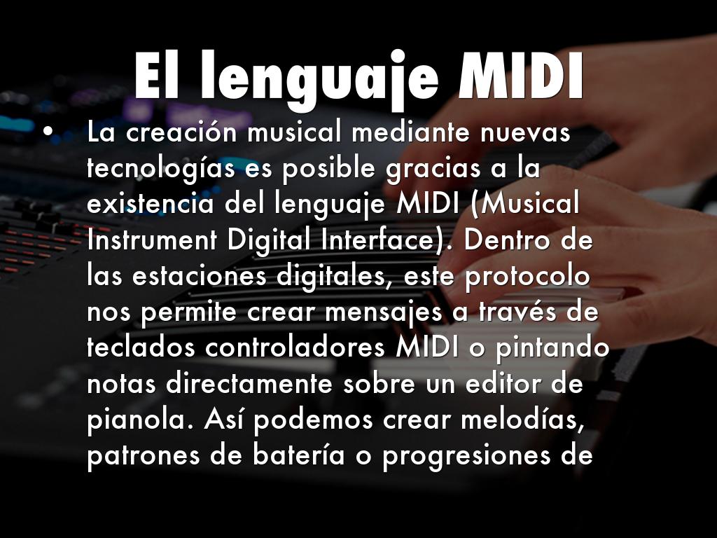 La creación musical mediante nuevas tecnologías es posible gracias a la existencia del lenguaje MIDI (Musical Instrument Digital Interface). Dentro de las estaciones digitales, este protocolo nos permite crear mensajes a través de teclados controladores MIDI o pintando notas directamente sobre un editor de pianola. Así podemos crear melodías, patrones de batería o progresiones de acordes. Esto es posible gracias a que los instrumentos virtuales incluidos en las DAW interpretan y convierten este lenguaje en sonido.