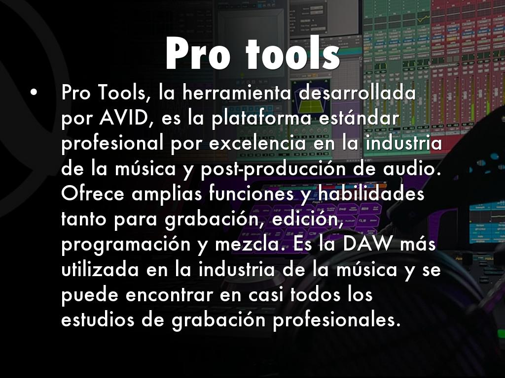 Pro Tools, la herramienta desarrollada por AVID, es la plataforma estándar profesional por excelencia en la industria de la música y post-producción de audio. Ofrece amplias funciones y habilidades tanto para grabación, edición, programación y mezcla. Es la DAW más utilizada en la industria de la música y se puede encontrar en casi todos los estudios de grabación profesionales.
