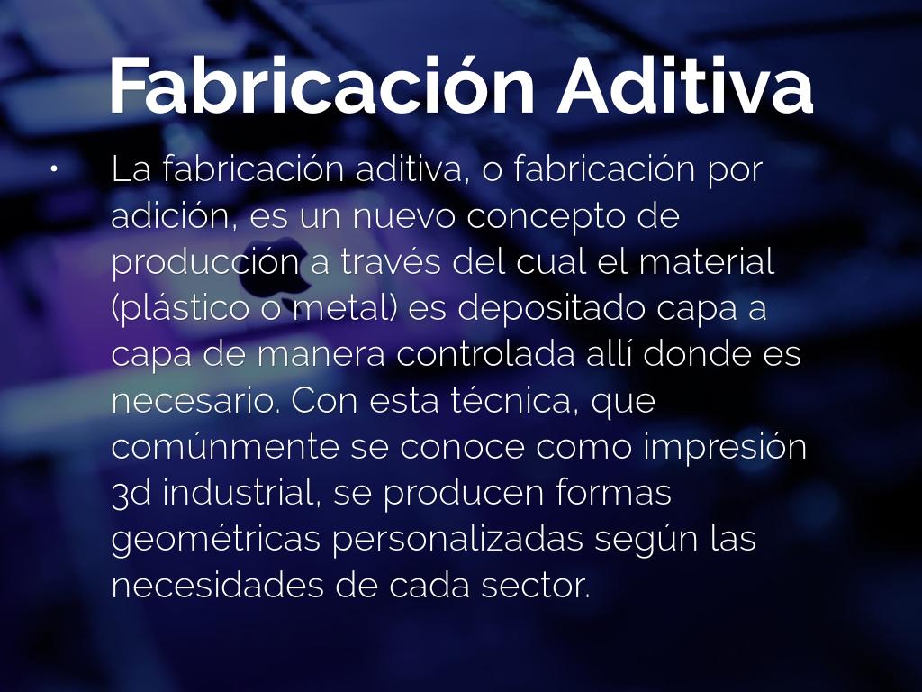 • La fabricación aditiva, o fabricación por adición, es un nuevo concepto de producción a través del cual el material (plástico o metal) es depositado capa a capa de manera controlada allí donde es necesario. Con esta técnica, que comúnmente se conoce como impresión 3d industrial, se producen formas geométricas personalizadas según las necesidades de cada sector.