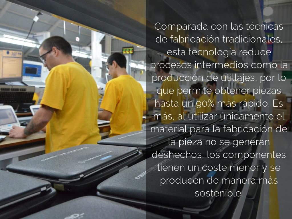 Comparada con las técnicas de fabricación tradicionales, esta tecnología reduce procesos intermedios como la producción de utillajes, por lo que permite obtener piezas hasta un 90% más rápido. Es más, al utilizar únicamente el material para la fabricación de la pieza no se generan deshechos, los componentes tienen un coste menor y se producen de manera más sostenible.