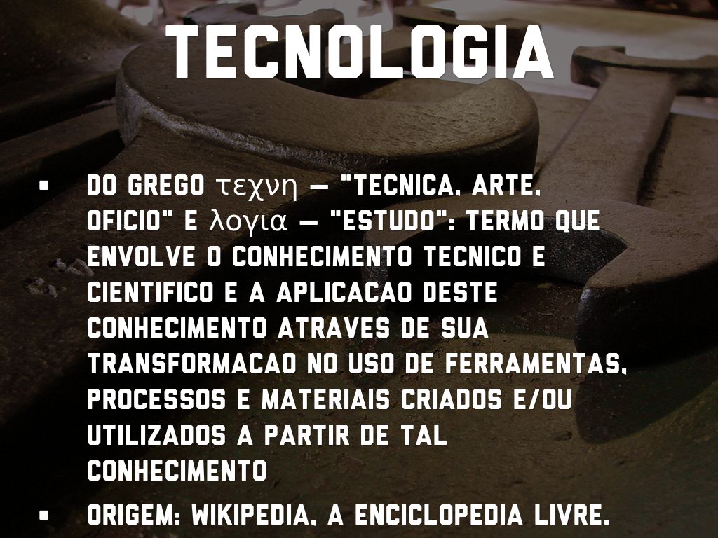 • do grego τεχνη — "tecnica, arte, oficio" e λογια — "estudo": termo que envolve o conhecimento tecnico e cientifico e a aplicacao deste conhecimento atraves de sua transformacao no uso de ferramentas, processos e materiais criados e/ou utilizados a partir de tal conhecimento