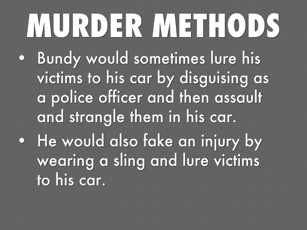 - Bundy would sometimes lure his victims to his car by disguising as a police officer and then assault and strangle them in his car.