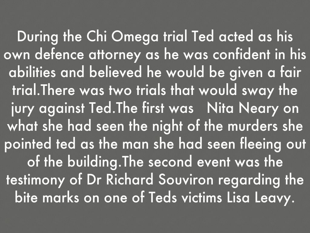 During the Chi Omega trial Ted acted as his own defence attorney as he was confident in his abilities and believed he would be given a fair trial.There was two trials that would sway the jury against Ted.The first was Nita Neary on what she had seen the night of the murders she pointed ted as the man she had seen fleeing out of the building.The second event was the testimony of Dr Richard Souviron regarding the bite marks on one of Teds victims Lisa Leavy.