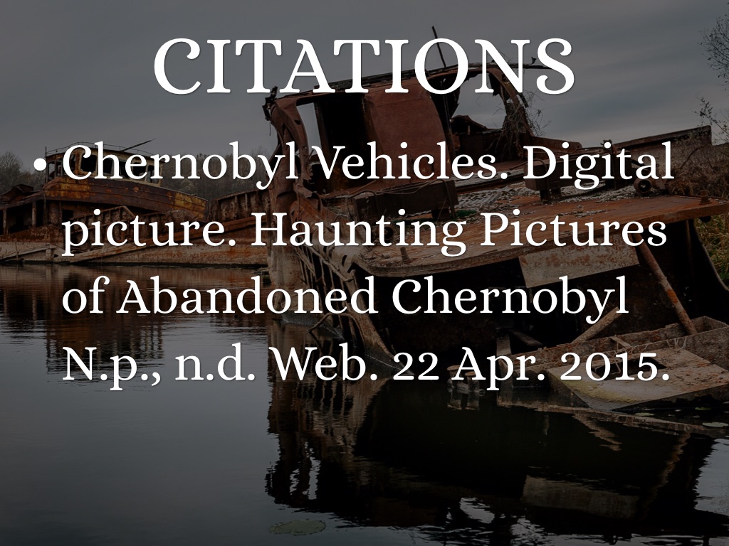 • Chernobyl Vehicles. Digital picture. Haunting Pictures of Abandoned Chernobyl N.p., n.d. Web. 22 Apr. 2015.