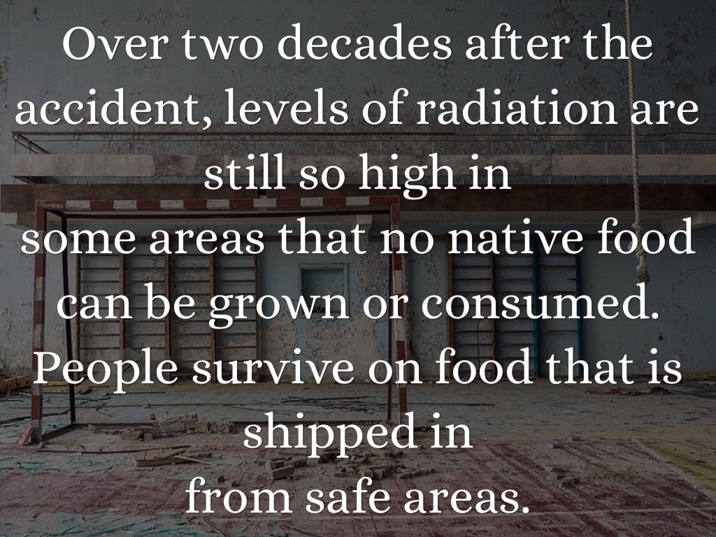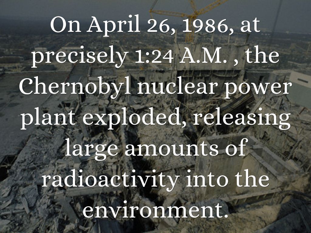 On April 26, 1986, at precisely 1:24 A.M. , the Chernobyl nuclear power plant exploded, releasing large amounts of radioactivity into the environment.