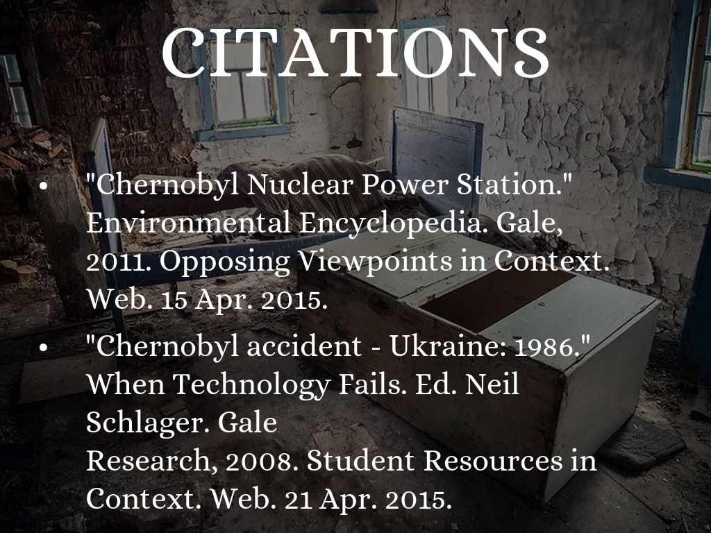 • "Chernobyl Nuclear Power Station." Environmental Encyclopedia. Gale, 2011. Opposing Viewpoints in Context. Web. 15 Apr. 2015.