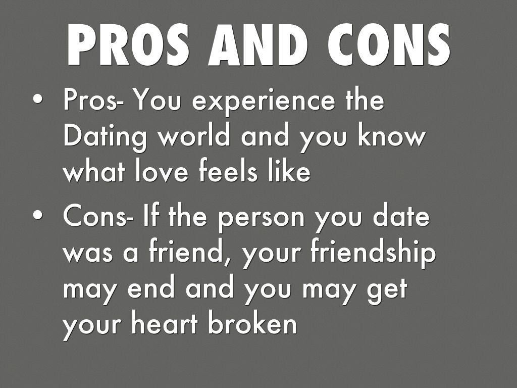 Cons- If the person you date was a friend, your friendship may end and you may get your heart broken