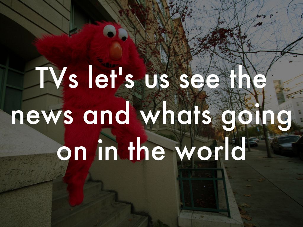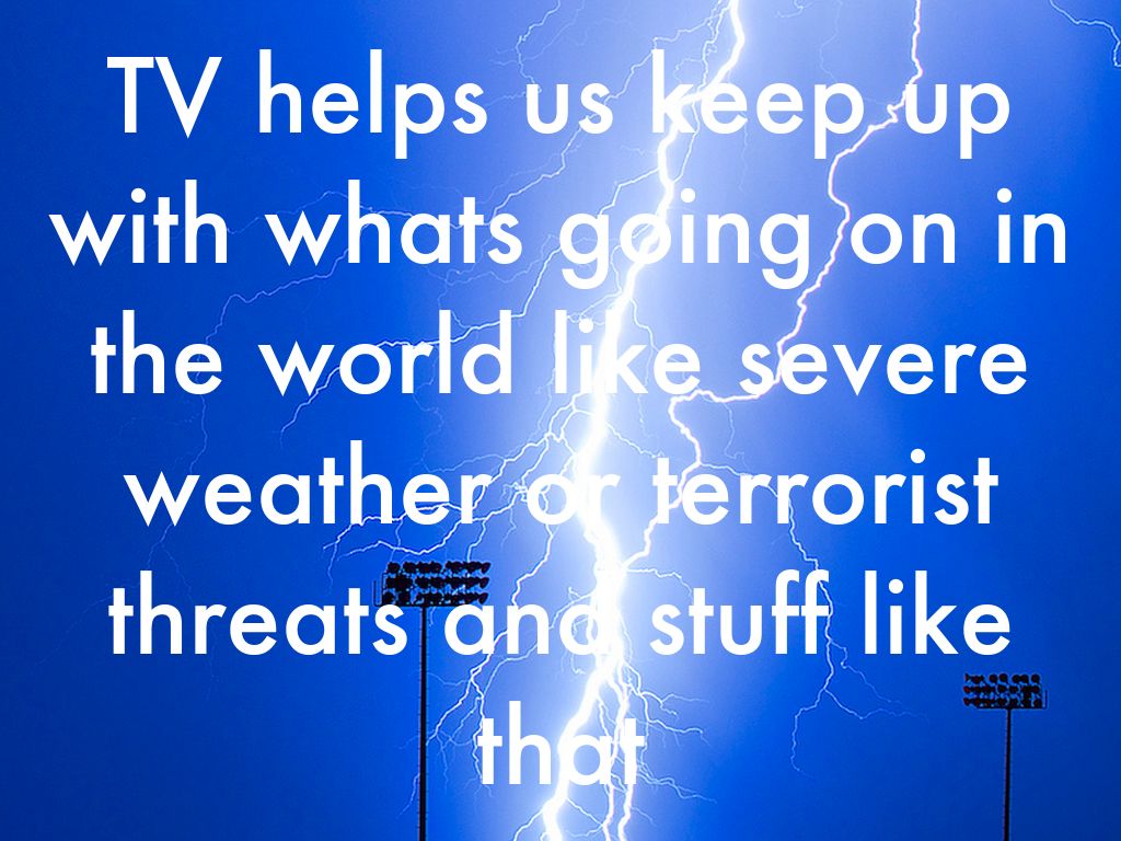 TV helps us keep up with whats going on in the world like severe weather or terrorist threats and stuff like that