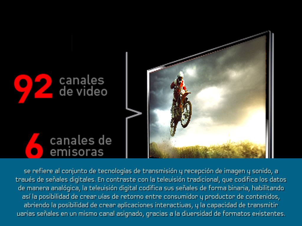 Se refiere al conjunto de tecnologías de transmisión y recepción de imagen y sonido, a través de señales digitales. En contraste con la televisión tradicional, que codifica los datos de manera analógica, la televisión digital codifica sus señales de forma binaria, habilitando así la posibilidad de crear vías de retorno entre consumidor y productor de contenidos, abriendo la posibilidad de crear aplicaciones interactivas, y la capacidad de transmitir varias señales en un mismo canal asignado, gracias a la diversidad de formatos existentes.
