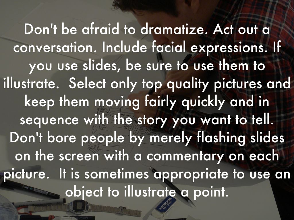 Don't be afraid to dramatize. Act out a conversation. Include facial expressions. If you use slides, be sure to use them to illustrate. Select only top quality pictures and keep them moving fairly quickly and in sequence with the story you want to tell. Don't bore people by merely flashing slides on the screen with a commentary on each picture. It is sometimes appropriate to use an object to illustrate a point.