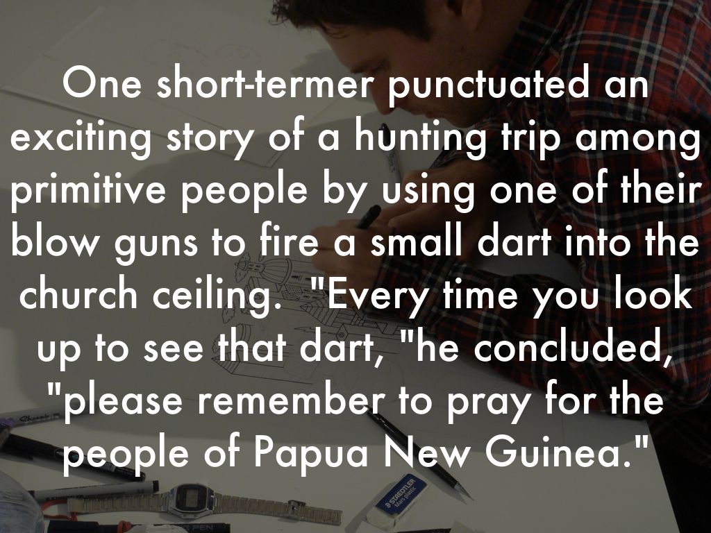 One short-termer punctuated an exciting story of a hunting trip among primitive people by using one of their blow guns to fire a small dart into the church ceiling. "Every time you look up to see that dart, "he concluded, "please remember to pray for the people of Papua New Guinea."