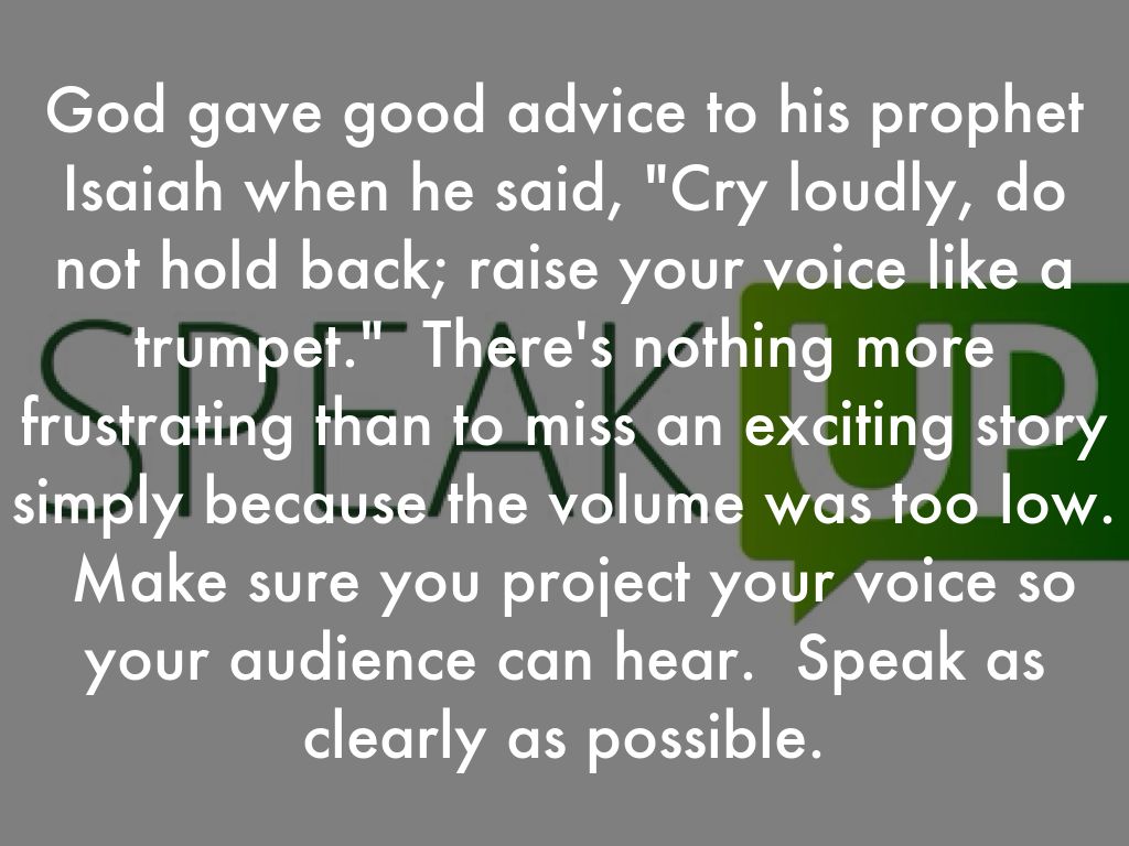 God gave good advice to his prophet Isaiah when he said, "Cry loudly, do not hold back; raise your voice like a trumpet." There's nothing more frustrating than to miss an exciting story simply because the volume was too low. Make sure you project your voice so your audience can hear. Speak as clearly as possible.