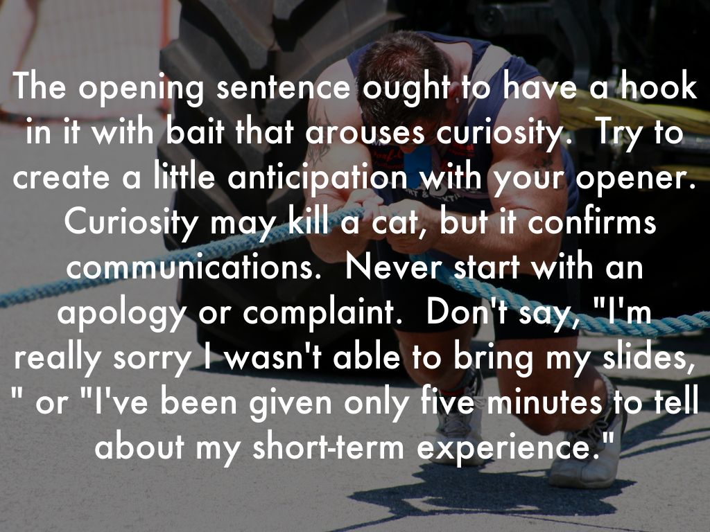 The opening sentence ought to have a hook in it with bait that arouses curiosity. Try to create a little anticipation with your opener. Curiosity may kill a cat, but it confirms communications. Never start with an apology or complaint. Don't say, "I'm really sorry I wasn't able to bring my slides, " or "I've been given only five minutes to tell about my short-term experience."
