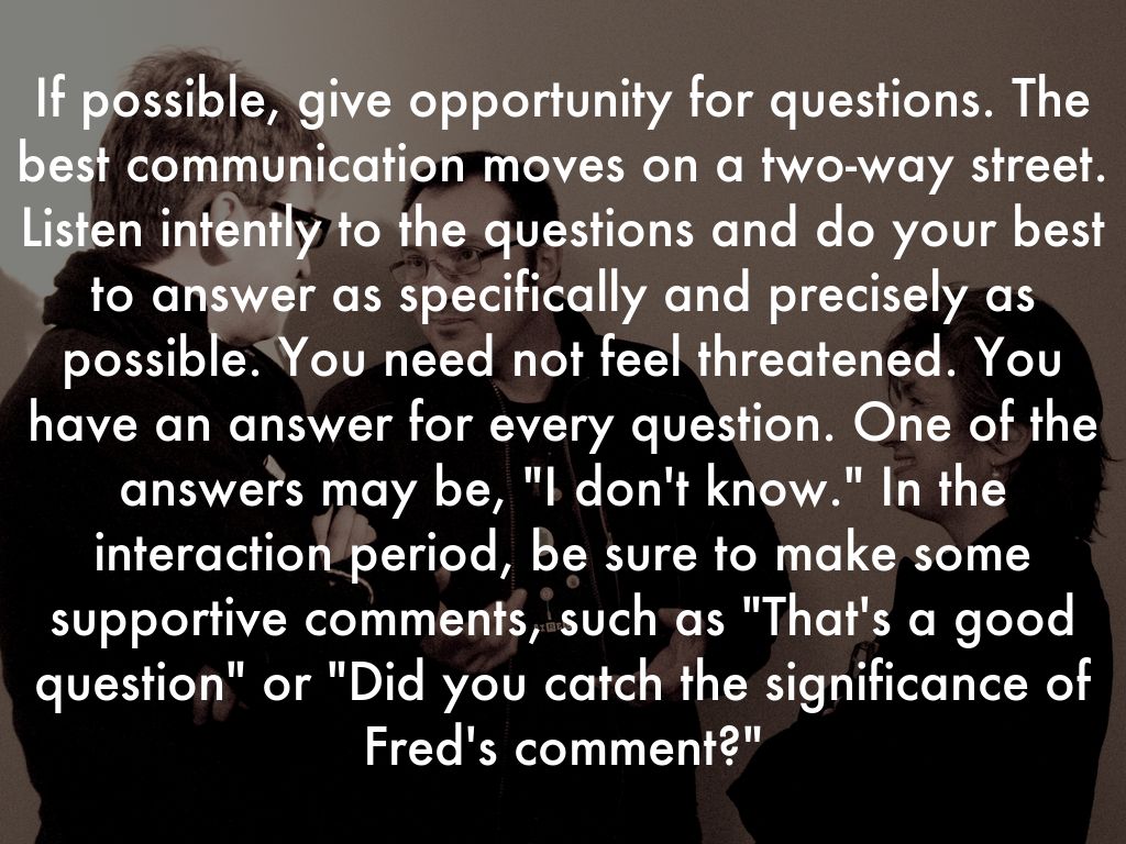 If possible, give opportunity for questions. The best communication moves on a two-way street. Listen intently to the questions and do your best to answer as specifically and precisely as possible. You need not feel threatened. You have an answer for every question. One of the answers may be, "I don't know." In the interaction period, be sure to make some supportive comments, such as "That's a good question" or "Did you catch the significance of Fred's comment?"