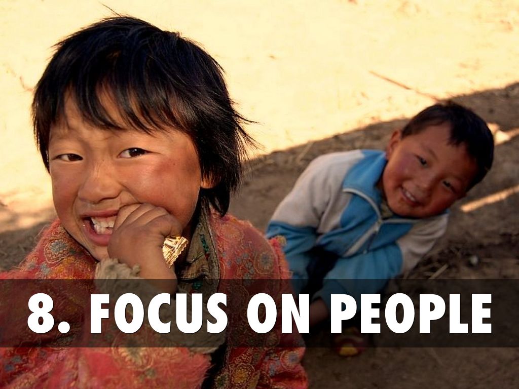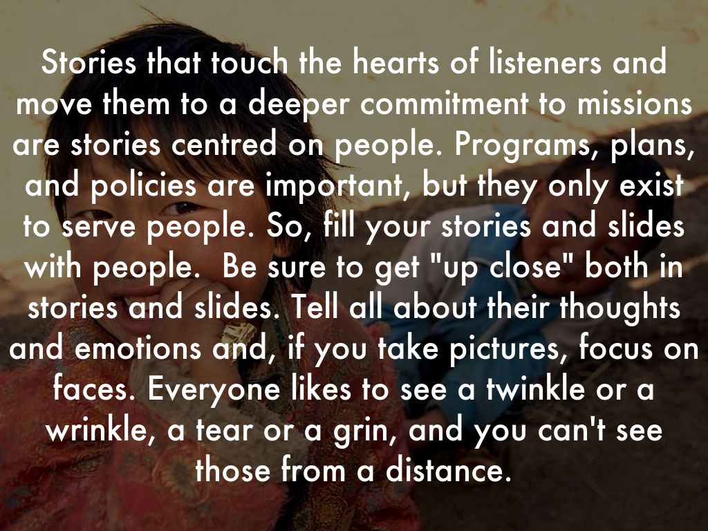 Stories that touch the hearts of listeners and move them to a deeper commitment to missions are stories centred on people. Programs, plans, and policies are important, but they only exist to serve people. So, fill your stories and slides with people. Be sure to get "up close" both in stories and slides. Tell all about their thoughts and emotions and, if you take pictures, focus on faces. Everyone likes to see a twinkle or a wrinkle, a tear or a grin, and you can't see those from a distance.