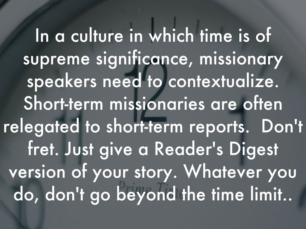 In a culture in which time is of supreme significance, missionary speakers need to contextualize. Short-term missionaries are often relegated to short-term reports. Don't fret. Just give a Reader's Digest version of your story. Whatever you do, don't go beyond the time limit..