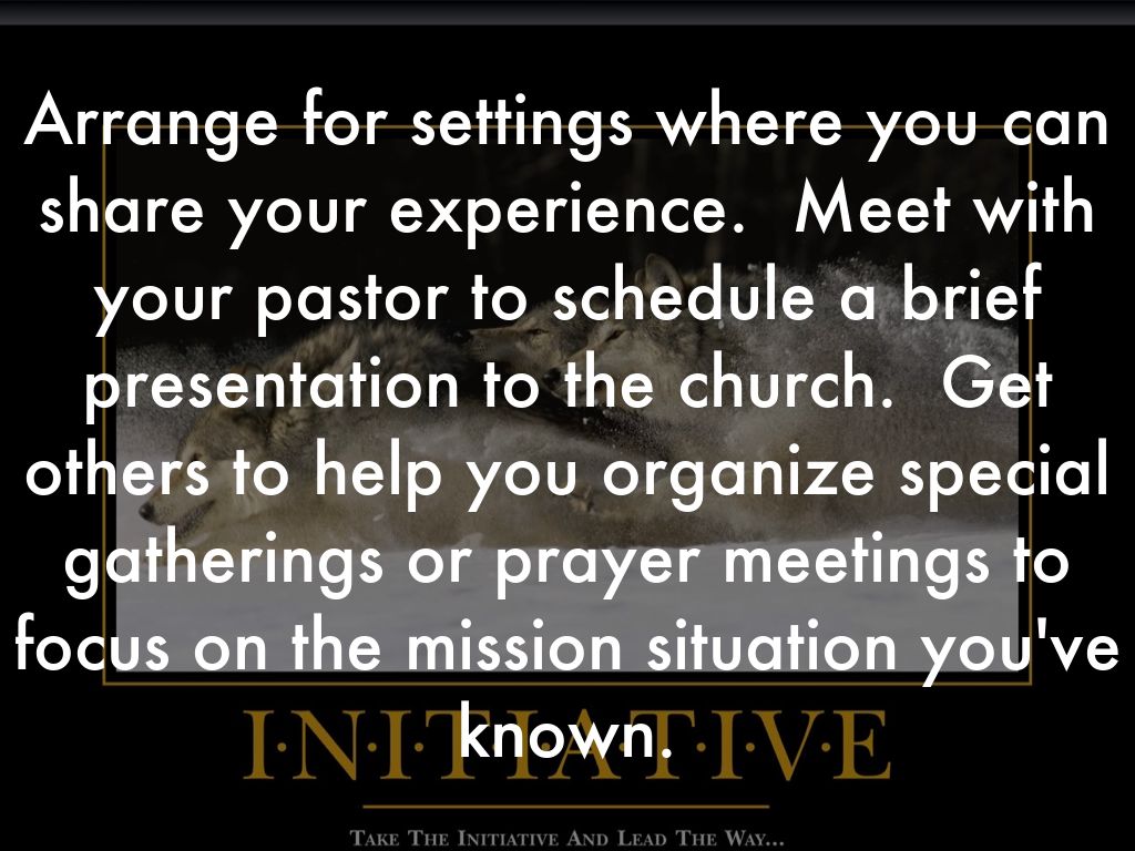 Arrange for settings where you can share your experience. Meet with your pastor to schedule a brief presentation to the church. Get others to help you organize special gatherings or prayer meetings to focus on the mission situation you've known.