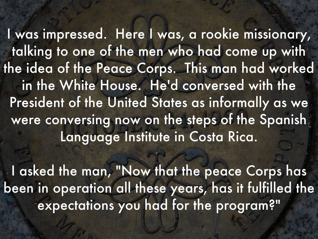 I was impressed. Here I was, a rookie missionary, talking to one of the men who had come up with the idea of the Peace Corps. This man had worked in the White House. He'd conversed with the President of the United States as informally as we were conversing now on the steps of the Spanish Language Institute in Costa Rica.