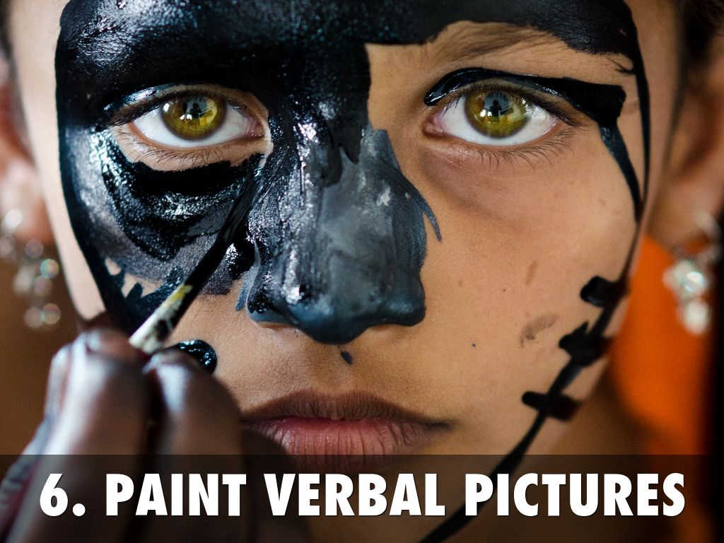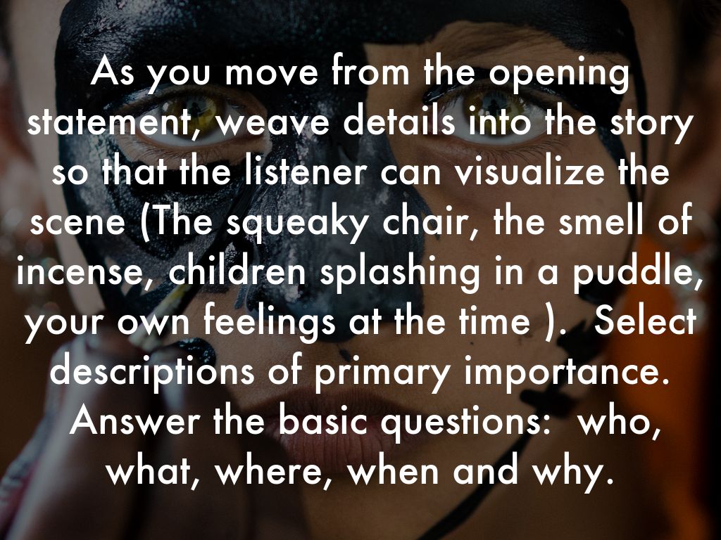 As you move from the opening statement, weave details into the story so that the listener can visualize the scene (The squeaky chair, the smell of incense, children splashing in a puddle, your own feelings at the time ). Select descriptions of primary importance. Answer the basic questions: who, what, where, when and why.