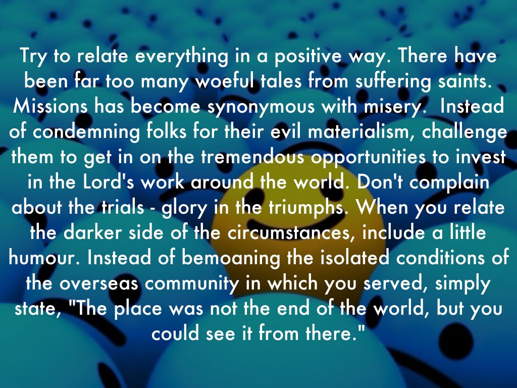 Try to relate everything in a positive way. There have been far too many woeful tales from suffering saints. Missions has become synonymous with misery. Instead of condemning folks for their evil materialism, challenge them to get in on the tremendous opportunities to invest in the Lord's work around the world. Don't complain about the trials - glory in the triumphs. When you relate the darker side of the circumstances, include a little humour. Instead of bemoaning the isolated conditions of the overseas community in which you served, simply state, "The place was not the end of the world, but you could see it from there."