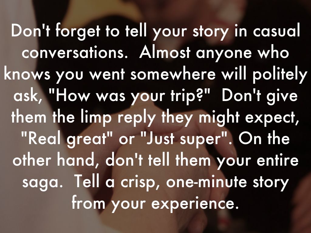 Don't forget to tell your story in casual conversations. Almost anyone who knows you went somewhere will politely ask, "How was your trip?" Don't give them the limp reply they might expect, "Real great" or "Just super". On the other hand, don't tell them your entire saga. Tell a crisp, one-minute story from your experience.