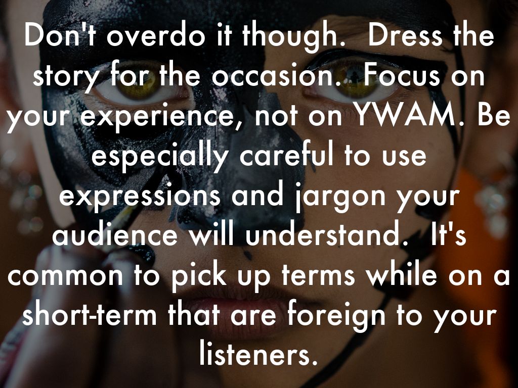 Don't overdo it though. Dress the story for the occasion. Focus on your experience, not on YWAM. Be especially careful to use expressions and jargon your audience will understand. It's common to pick up terms while on a short-term that are foreign to your listeners.