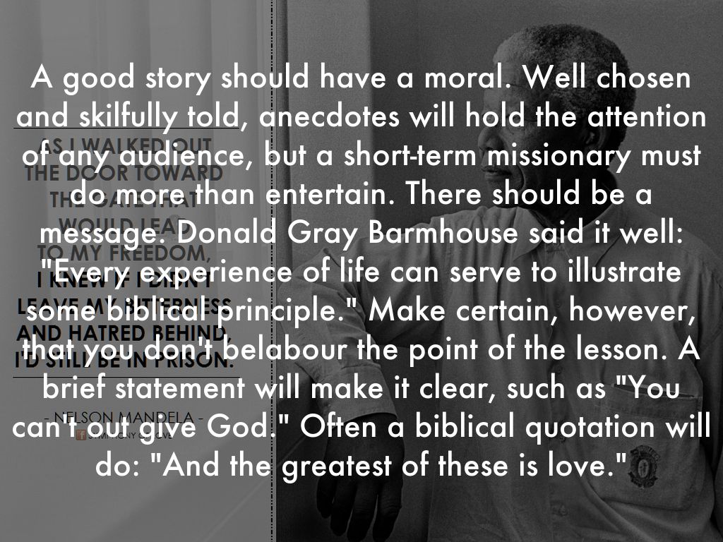 A good story should have a moral. Well chosen and skilfully told, anecdotes will hold the attention of any audience, but a short-term missionary must do more than entertain. There should be a message. Donald Gray Barmhouse said it well: "Every experience of life can serve to illustrate some biblical principle." Make certain, however, that you don't belabour the point of the lesson. A brief statement will make it clear, such as "You can't out give God." Often a biblical quotation will do: "And the greatest of these is love."