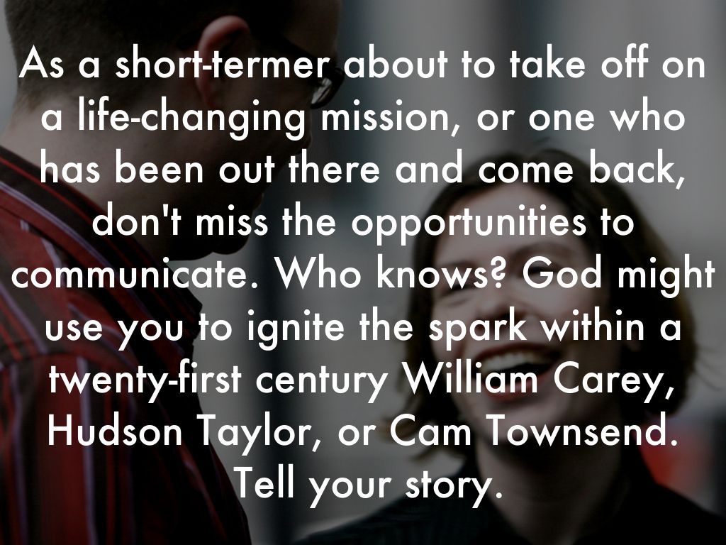 As a short-termer about to take off on a life-changing mission, or one who has been out there and come back, don't miss the opportunities to communicate. Who knows? God might use you to ignite the spark within a twenty-first century William Carey, Hudson Taylor, or Cam Townsend. Tell your story.