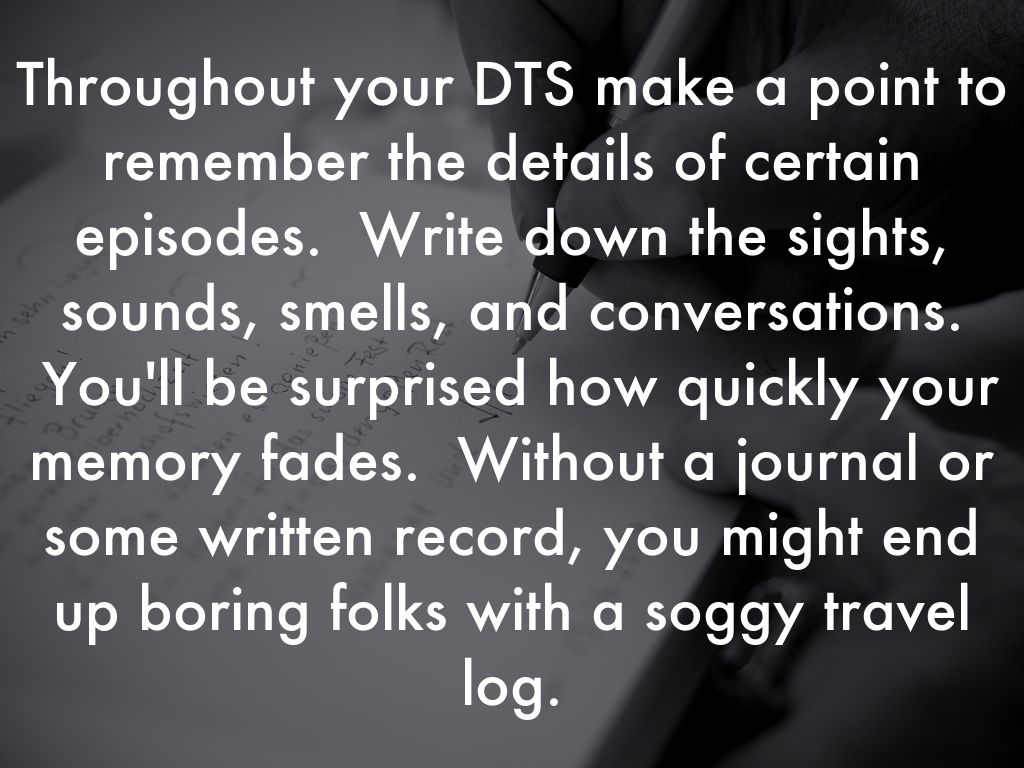 Throughout your DTS make a point to remember the details of certain episodes. Write down the sights, sounds, smells, and conversations. You'll be surprised how quickly your memory fades. Without a journal or some written record, you might end up boring folks with a soggy travel log.