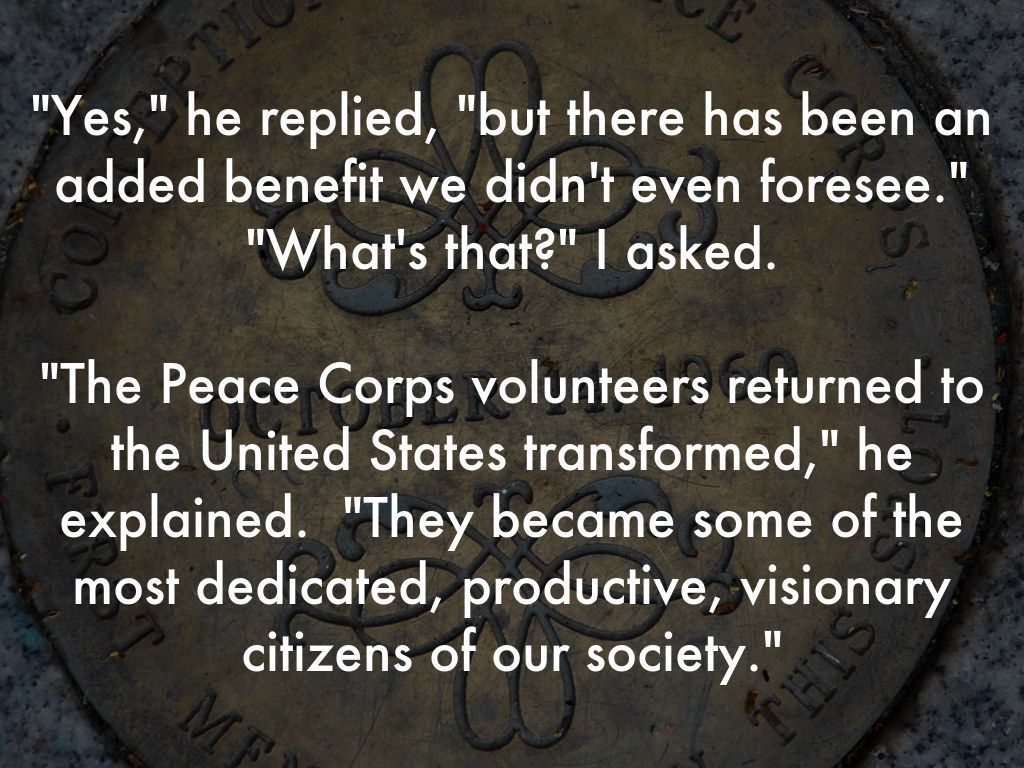 "The Peace Corps volunteers returned to the United States transformed," he explained. "They became some of the most dedicated, productive, visionary citizens of our society."