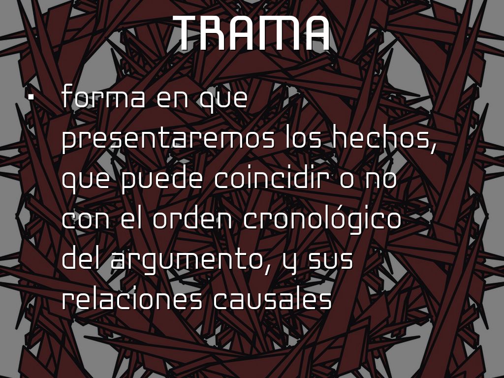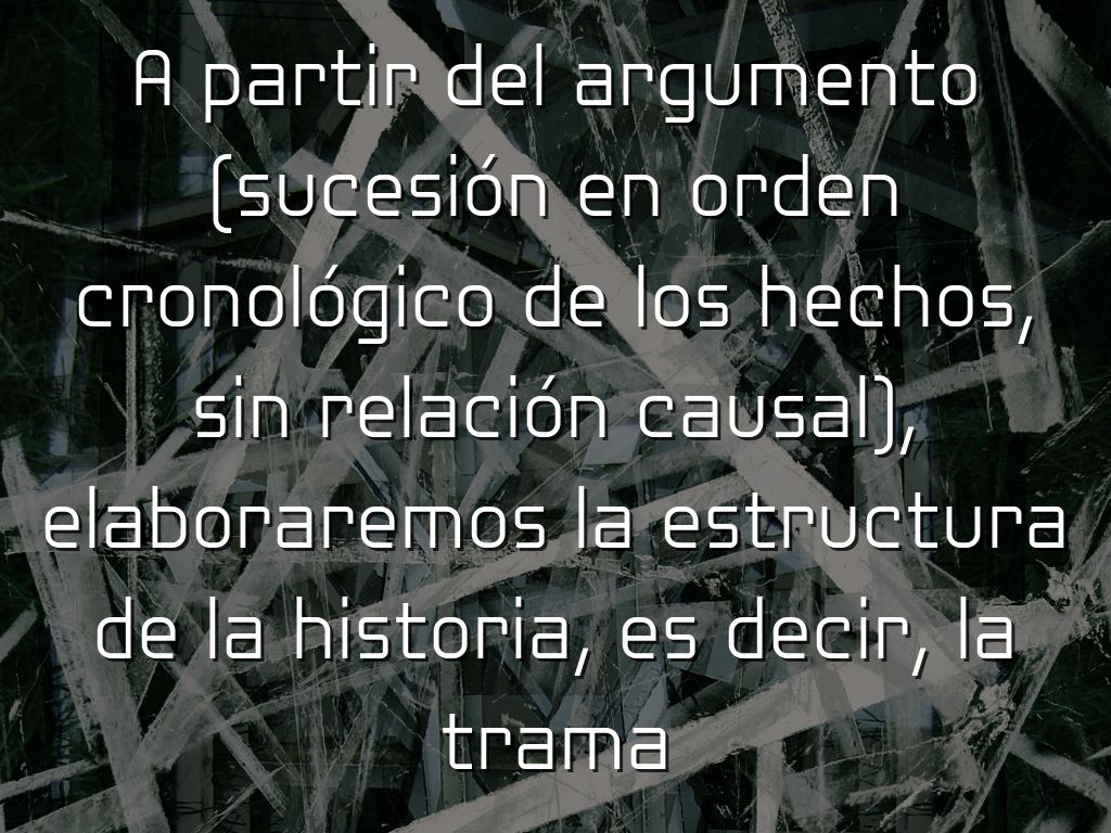 A partir del argumento (sucesión en orden cronológico de los hechos, sin relación causal), elaboraremos la estructura de la historia, es decir, la trama