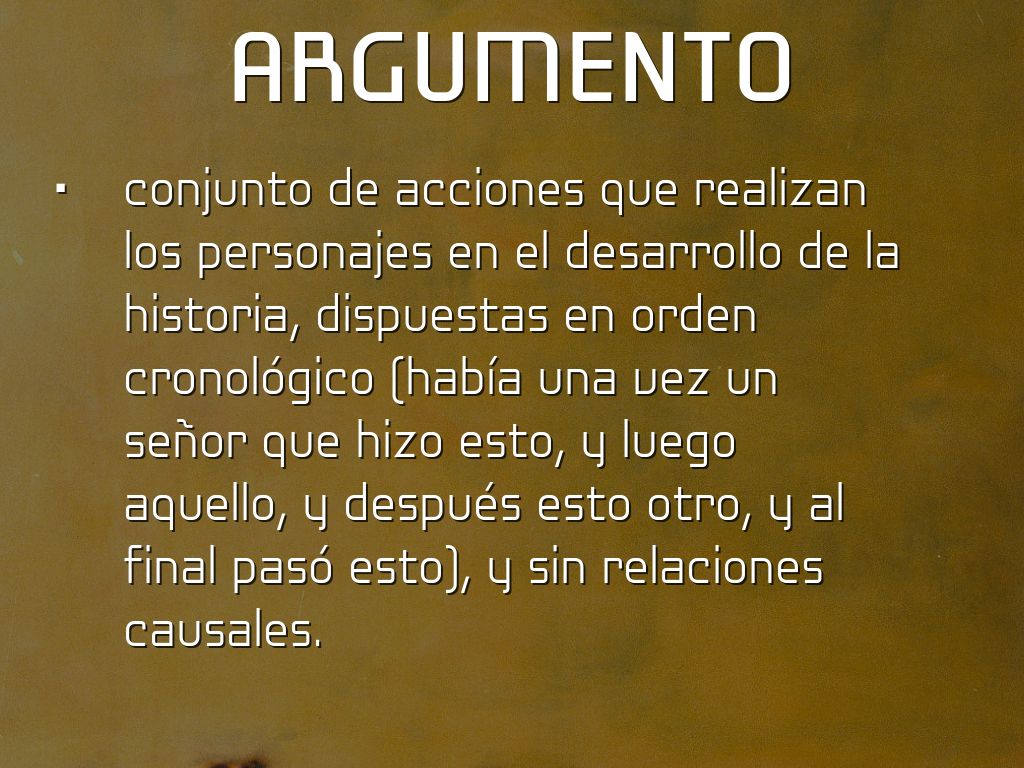 conjunto de acciones que realizan los personajes en el desarrollo de la historia, dispuestas en orden cronológico (había una vez un señor que hizo esto, y luego aquello, y después esto otro, y al final pasó esto), y sin relaciones causales.