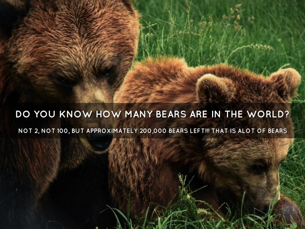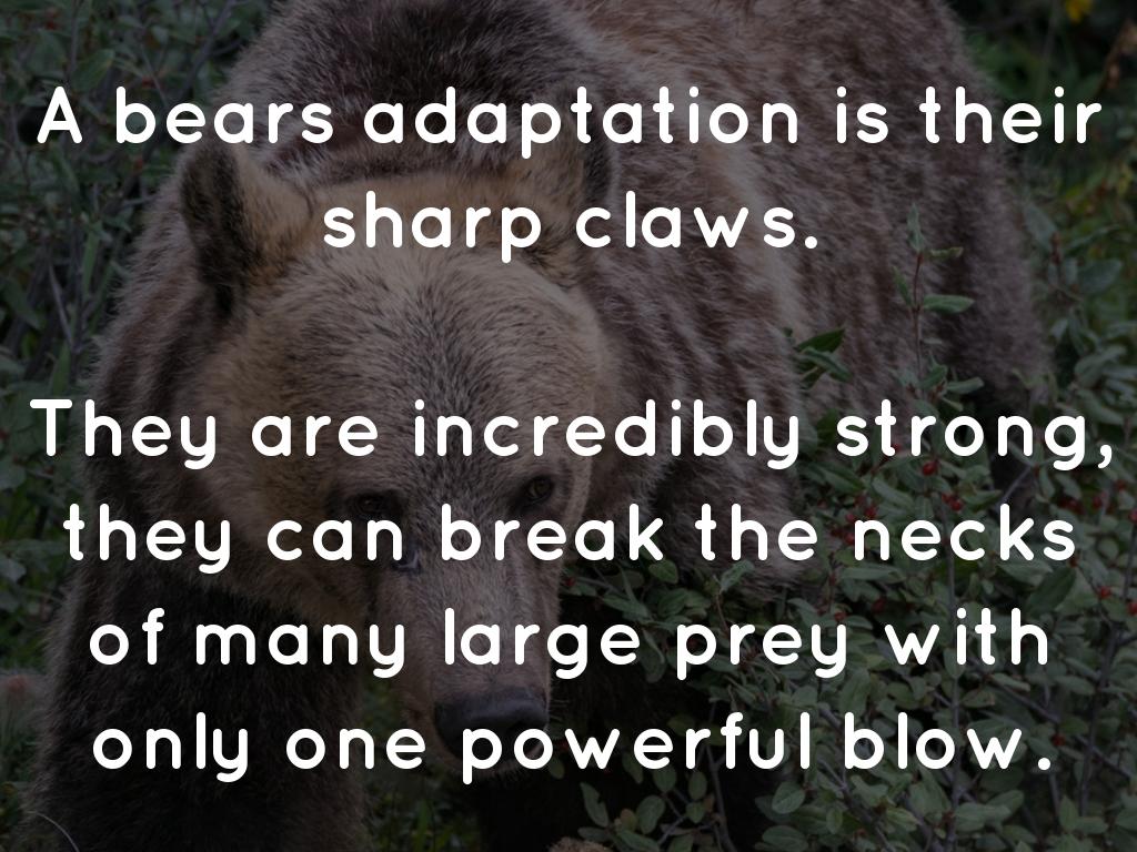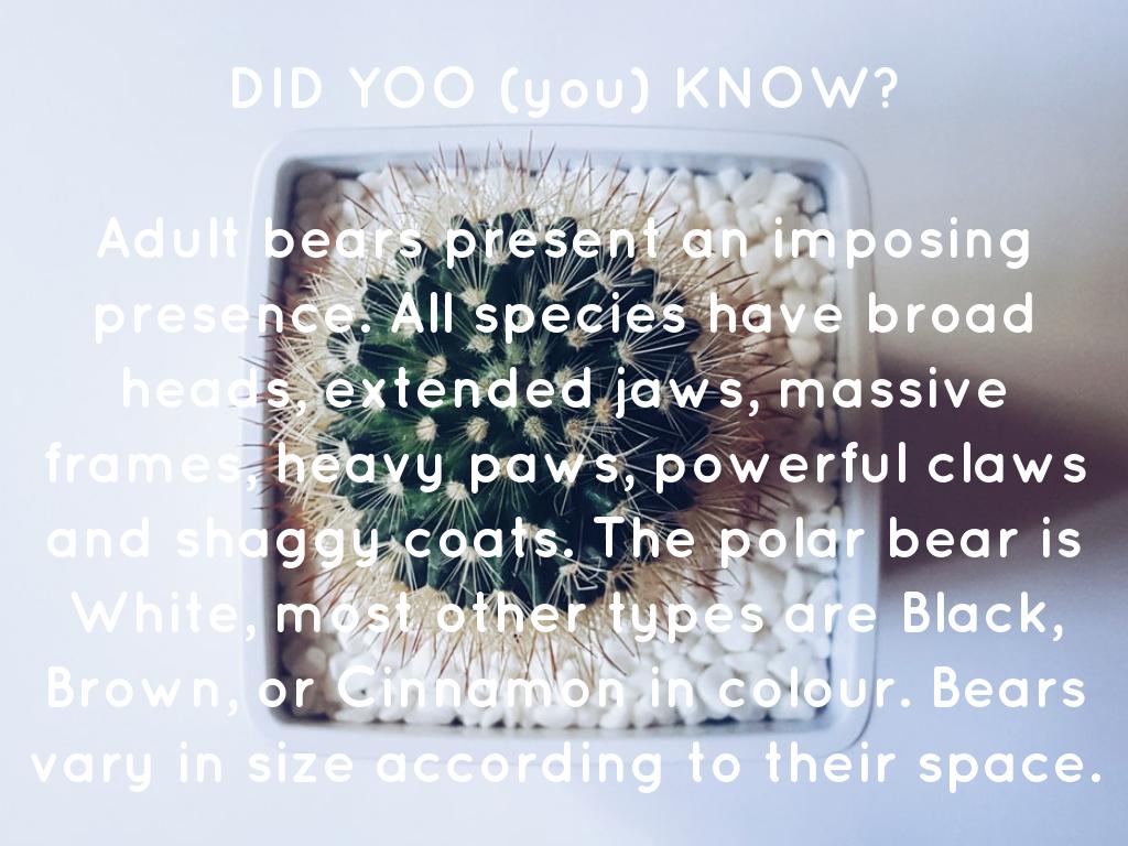 Adult bears present an imposing presence. All species have broad heads, extended jaws, massive frames, heavy paws, powerful claws and shaggy coats. The polar bear is White, most other types are Black, Brown, or Cinnamon in colour. Bears vary in size according to their space.