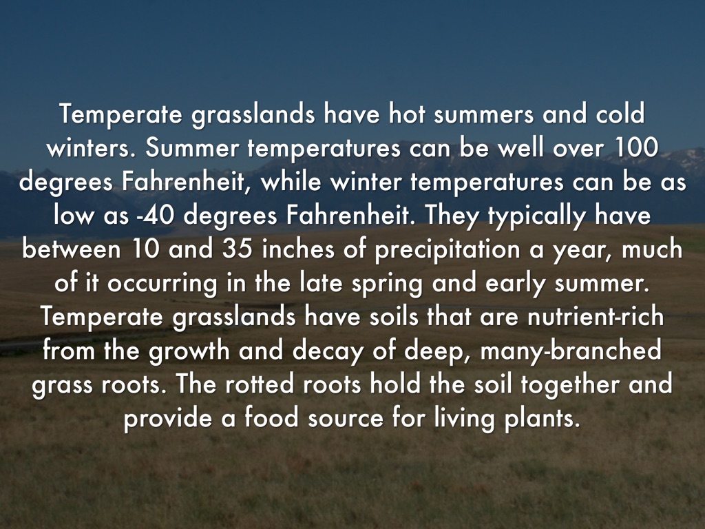 Temperate grasslands have hot summers and cold winters. Summer temperatures can be well over 100 degrees Fahrenheit, while winter temperatures can be as low as -40 degrees Fahrenheit. They typically have between 10 and 35 inches of precipitation a year, much of it occurring in the late spring and early summer. Temperate grasslands have soils that are nutrient-rich from the growth and decay of deep, many-branched grass roots. The rotted roots hold the soil together and provide a food source for living plants.