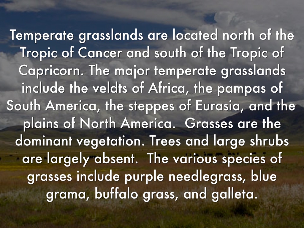 Temperate grasslands are located north of the Tropic of Cancer and south of the Tropic of Capricorn. The major temperate grasslands include the veldts of Africa, the pampas of South America, the steppes of Eurasia, and the plains of North America. Grasses are the dominant vegetation. Trees and large shrubs are largely absent. The various species of grasses include purple needlegrass, blue grama, buffalo grass, and galleta.