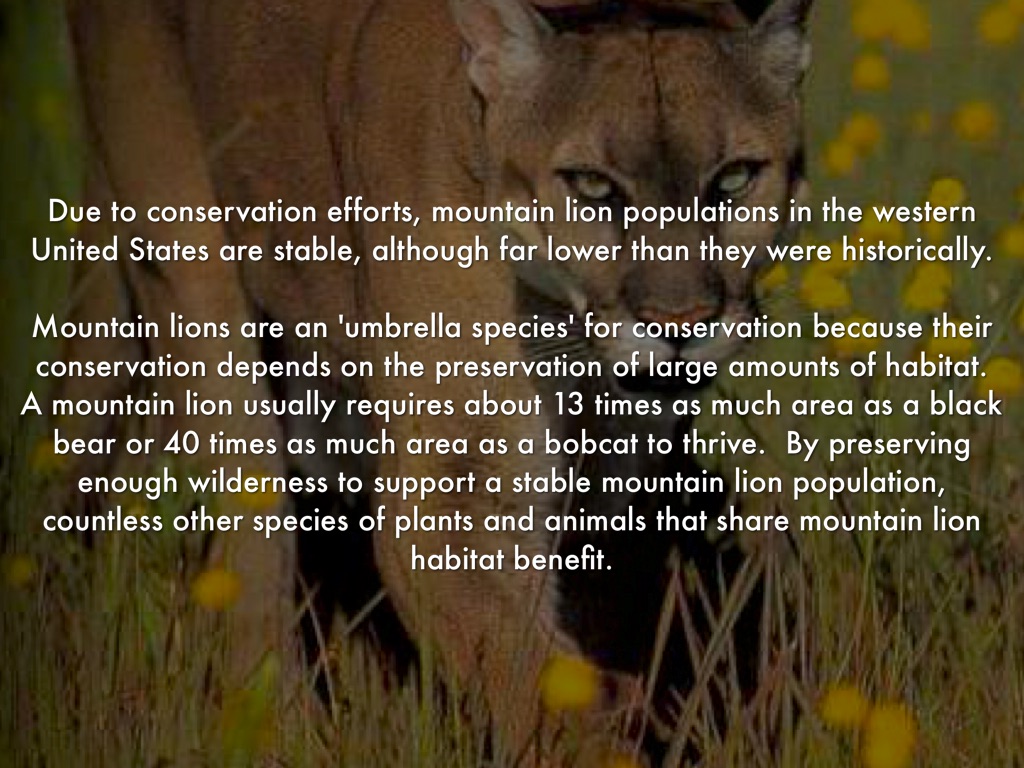Mountain lions are an 'umbrella species' for conservation because their conservation depends on the preservation of large amounts of habitat. A mountain lion usually requires about 13 times as much area as a black bear or 40 times as much area as a bobcat to thrive. By preserving enough wilderness to support a stable mountain lion population, countless other species of plants and animals that share mountain lion habitat benefit.