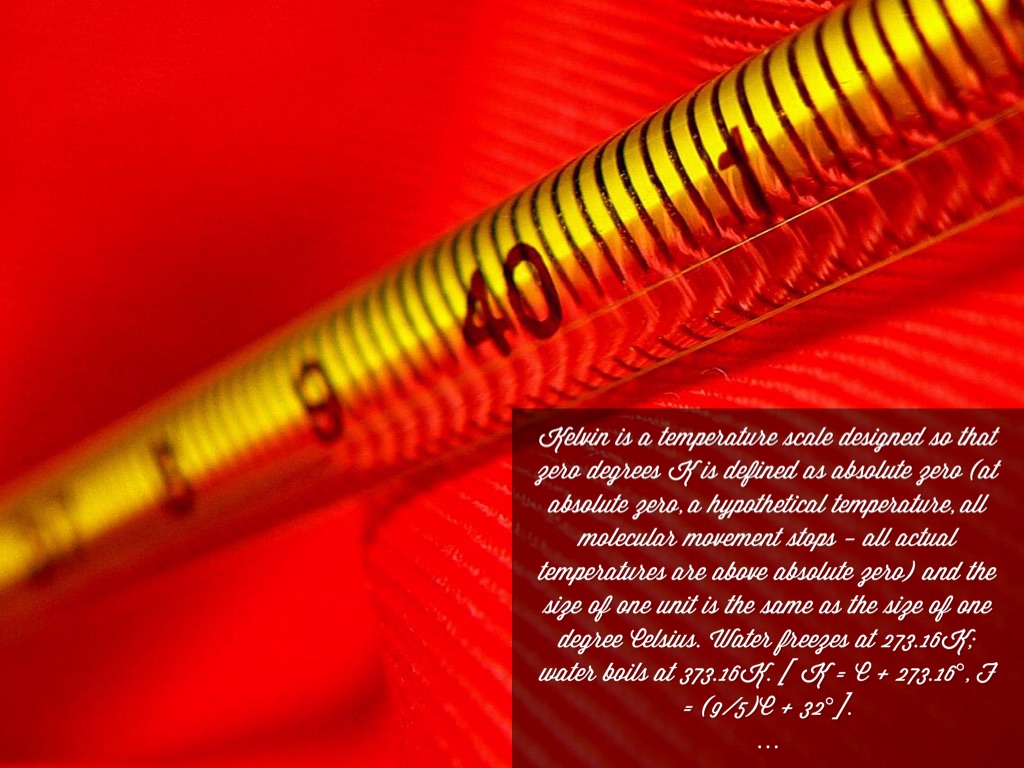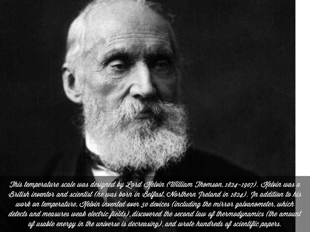 This temperature scale was designed by Lord Kelvin (William Thomson, 1824-1907). Kelvin was a British inventor and scientist (he was born in Belfast, Northern Ireland in 1824). In addition to his work on temperature, Kelvin invented over 50 devices (including the mirror galvanometer, which detects and measures weak electric fields), discovered the second law of thermodynamics (the amount of usable energy in the universe is decreasing), and wrote hundreds of scientific papers.