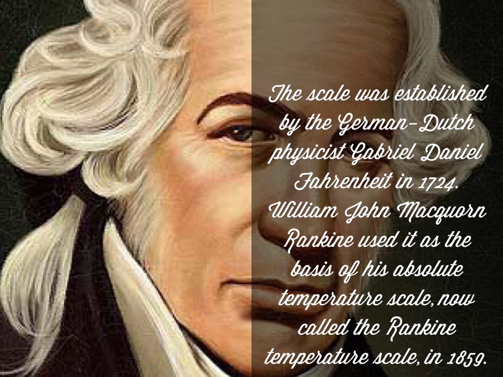 The scale was established by the German-Dutch physicist Gabriel Daniel Fahrenheit in 1724. William John Macquorn Rankine used it as the basis of his absolute temperature scale, now called the Rankine temperature scale, in 1859.