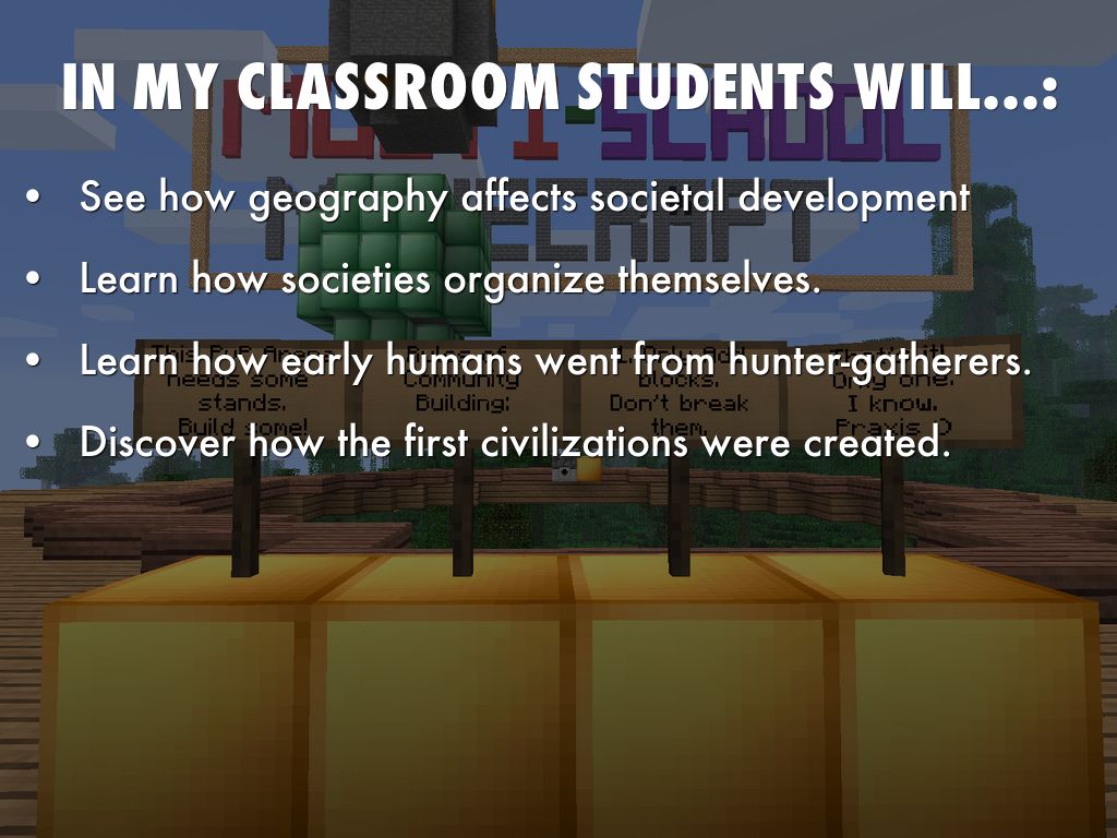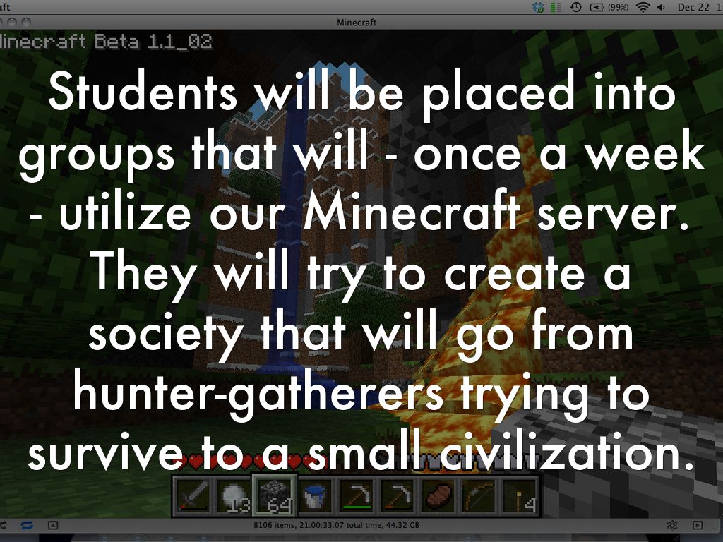 Students will be placed into groups that will - once a week - utilize our Minecraft server. They will try to create a society that will go from hunter-gatherers trying to survive to a small civilization.